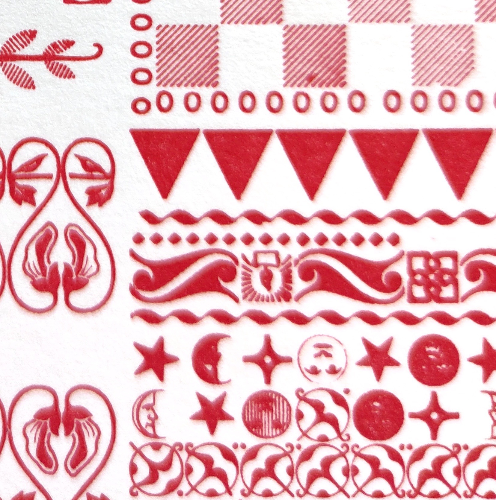 Deze schriften zijn bedrukt met ornamenten uit de letterbak. Je kan zien dat deze elementen uit verschillende periodes van de boekdrukkunst komen, een klein beetje art deco, jugendstil en zelfs nog wat ouder. De honderden ornamenten zijn ‘gezet’ in een tegeltjes stramien. Je kan er bv. letters in terugvinden of schaakstuk elementen… Aan de voorkant is een klein kader met etiket ruimte voor je naam en/of project. Aan de draadjes kun je ook nog een extra lint knopen evt. Deze schriften zijn ook verkrijgbaar in zwart, rood, blauw & groen en als blanco schrift. Ook verkrijgbaar als complete set van 4 kleuren, met lijn of blanco.