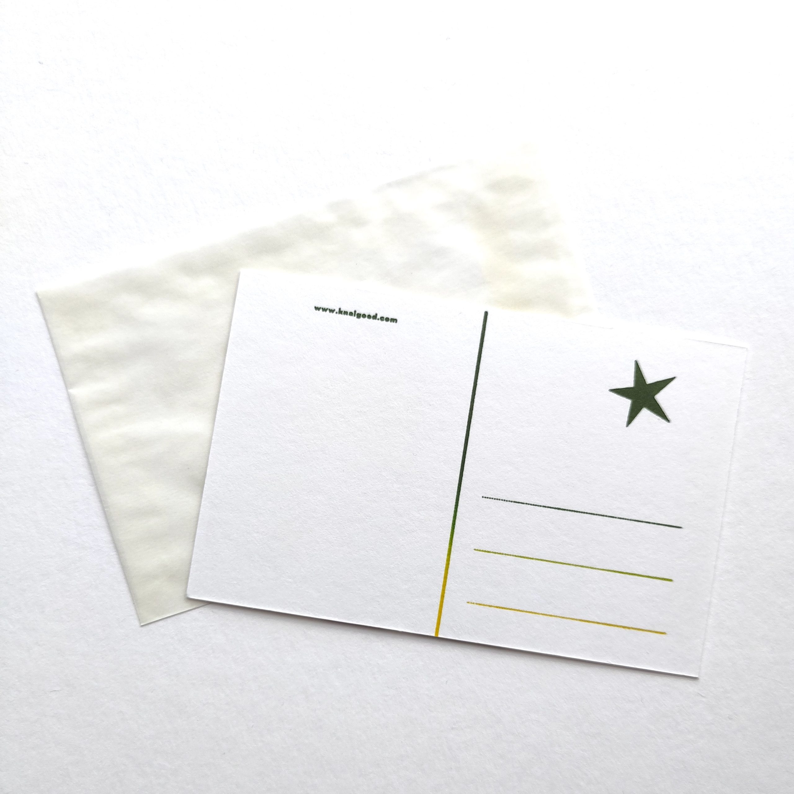 Kaarten zijn geproduceerd door middel van veel handwerk op 300gr karton met lichte structuur. De kaarten hebben een doorzichtige envelop van pergamijn. De inkten die zijn gebruikt is daarbij ook mileu-vriendelijk.