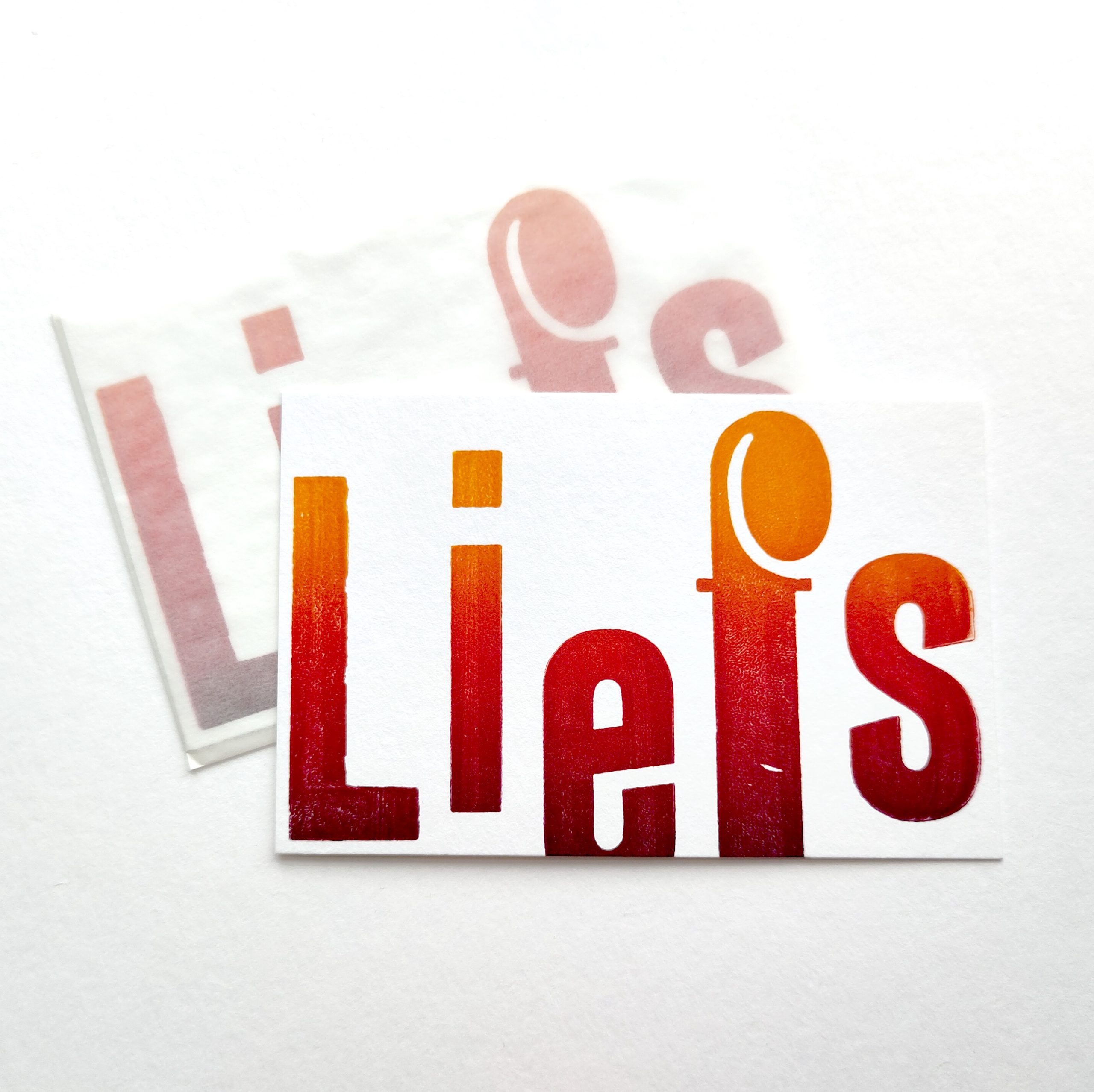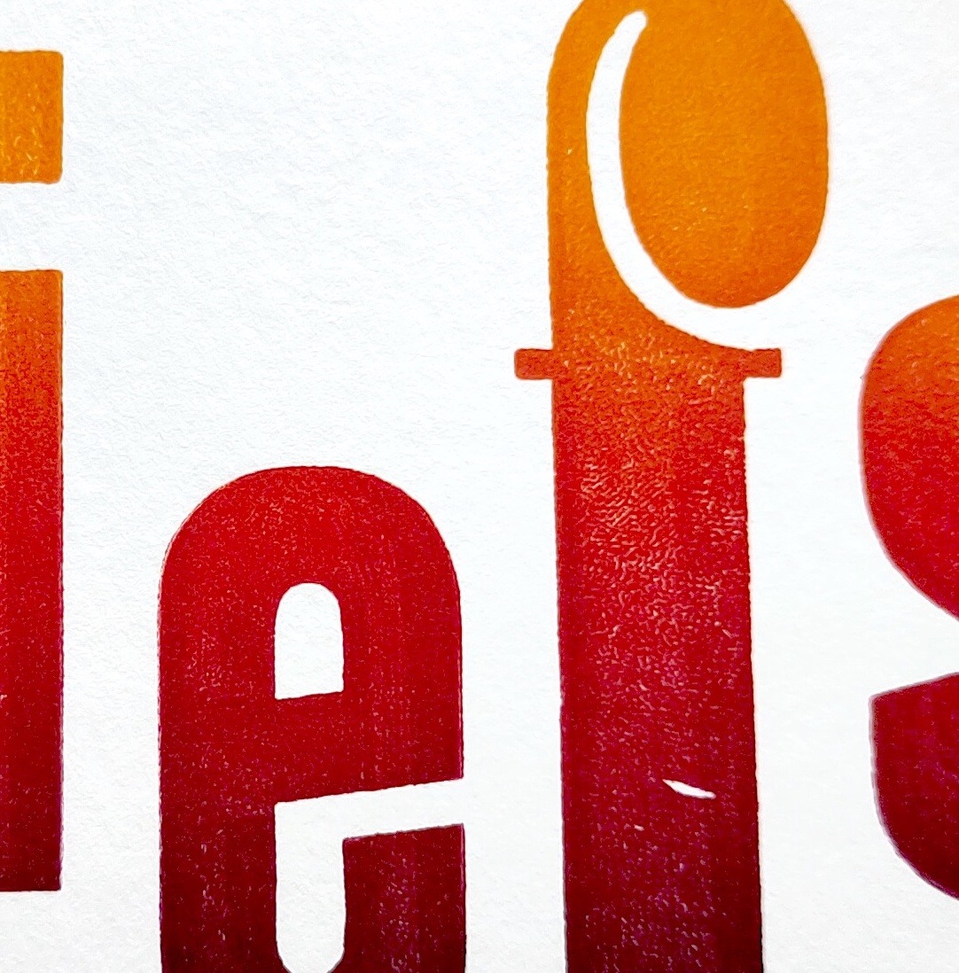 Gedrukt met een bijzondere letter uit de drukkerij. Daarbij is er een prachtig kleurverloop gebruikt in het drukwerk, waarbij elke kaart nèt even iets anders is.