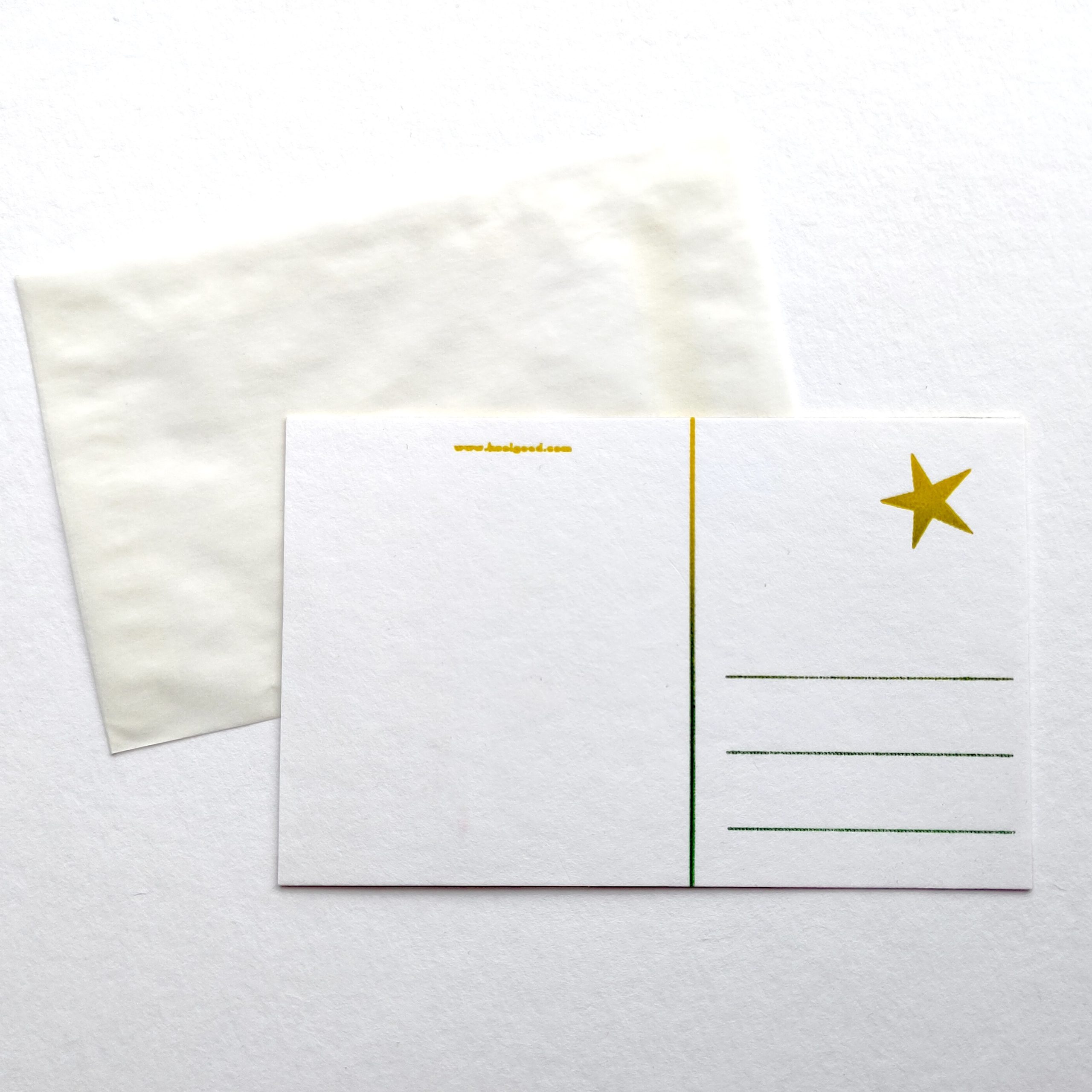 De kaarten zijn geproduceerd door middel van veel handwerk op 300gr karton met lichte structuur. De kaarten hebben een doorzichtige envelop van pergamijn.Als je wil kan je daardoor dezelfde kaart 2x versturen, door de eerste keer gewoon op de envelop schrijven! De inkten die zijn gebruikt is daarbij ook mileu-vriendelijk.