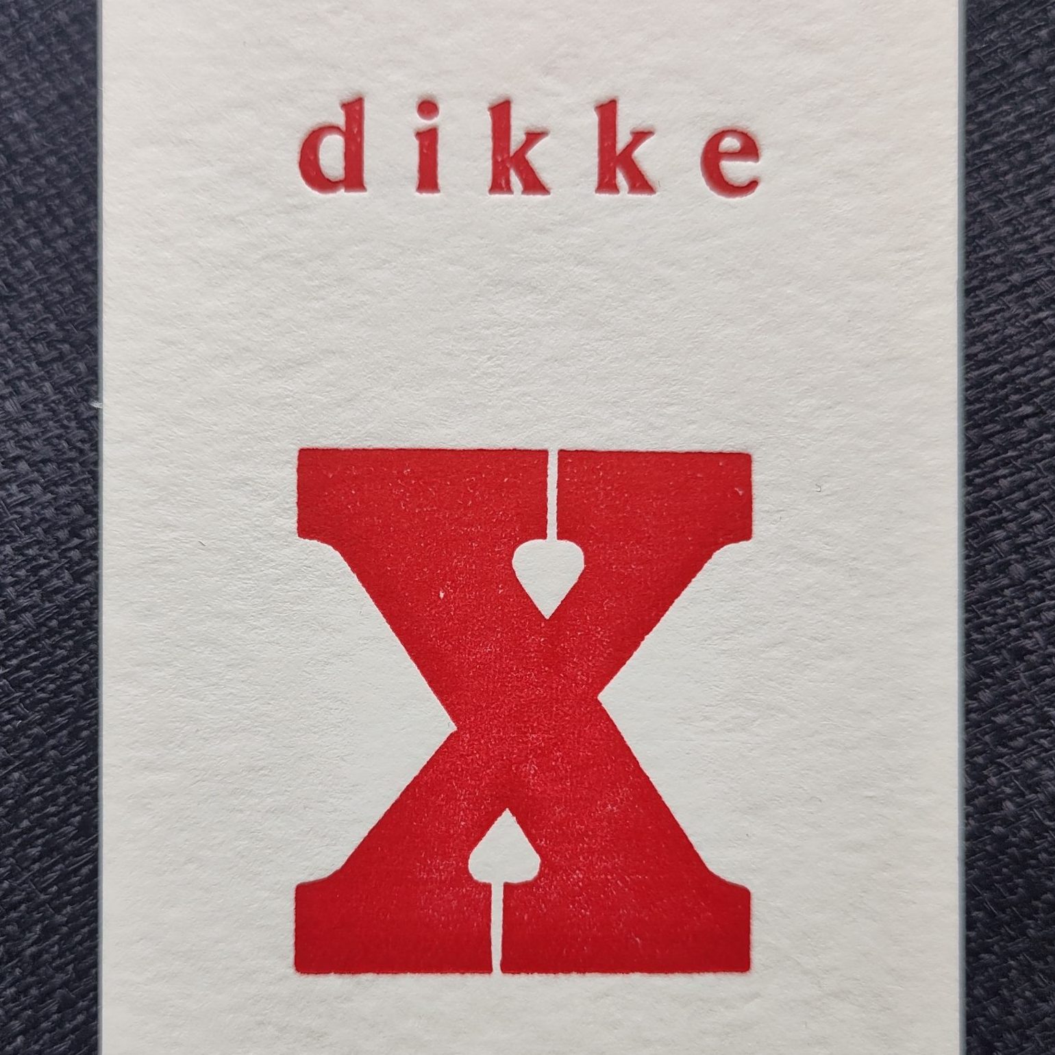Dit originele kaartje, dikke X (schreef), is gedrukt met een mooie houten letter uit de letterbak. (Een combinatie van een Romaansch en Egyptienne voor de kenners onder ons.) De rode inkt is ecologisch verantwoord. Het papier van 300 grams met een subtiele vezel heeft een mooie warme creme kleur.